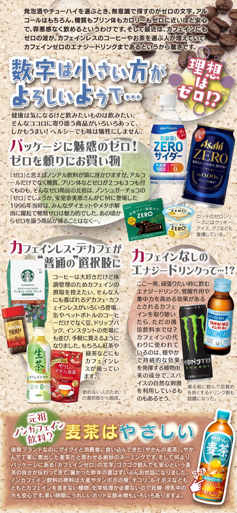 発泡酒やチューハイを選ぶとき、無意識で探すのがゼロの文字。アルコールはもちろん、糖質もプリン体もカロリーもゼロに近いほど安心で、罪悪感なく飲めるというわけです。そして最近は、カフェインにもゼロの波が。カフェインレスのコーヒーやお茶を選ぶ人が増えていて、カフェインゼロのエナジードリンクまであるというから驚きです。