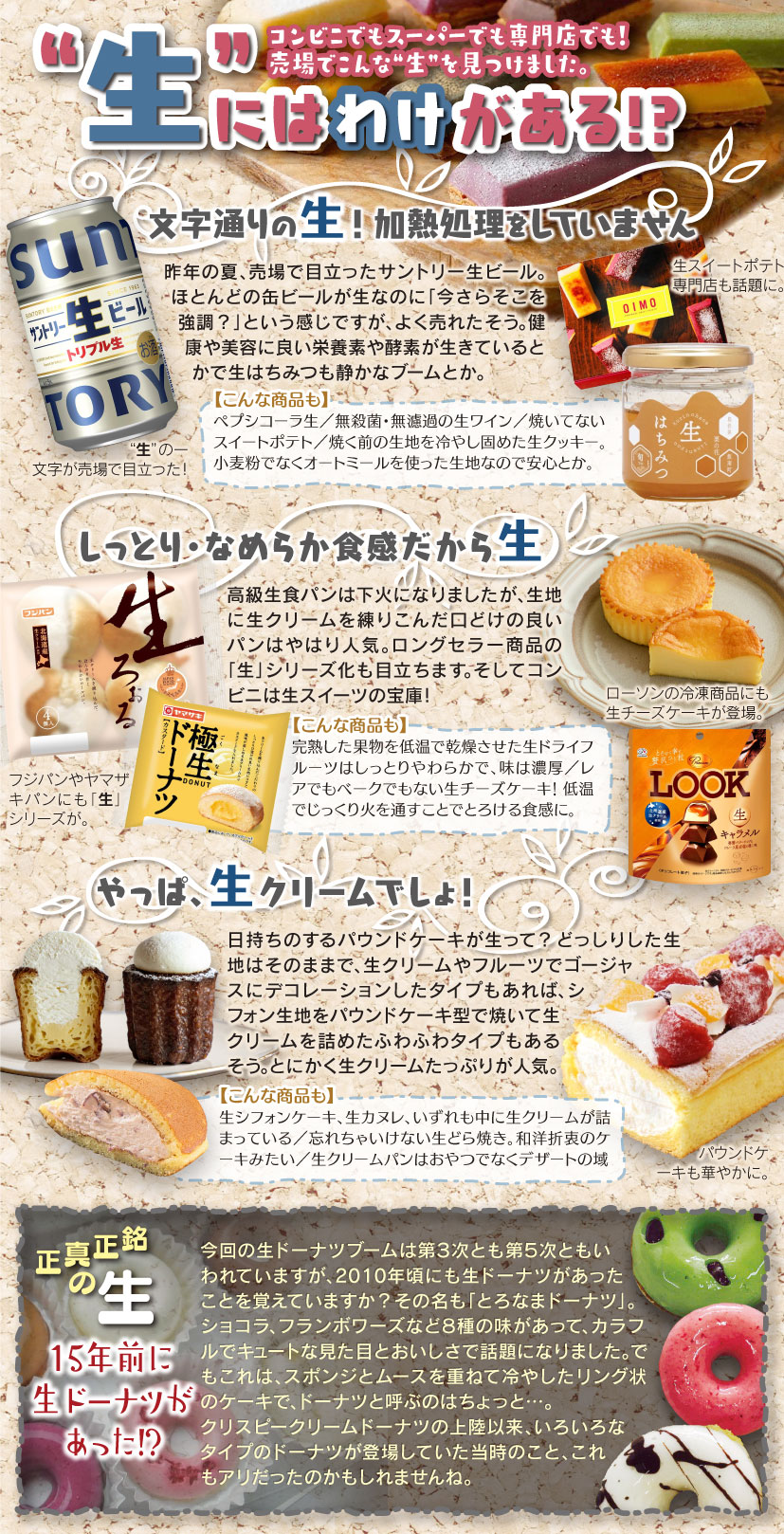 生チョコ、生ハム、生カルビ、生パスタ…“生”がつくと俄然おいしそうに感じるのはなぜでしょうか?生ドーナツや生カヌレ、生しぼりモンブランなんてものも登場し、生○○がどんどん増えていきそうな勢いです。でもね、揚げてあるのに生ドーナツって、どうなのよ?
